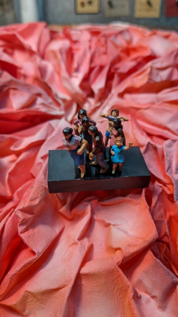 I usually approach my work with a concept. I will make sketches on paper or digital devices to explore composition, color, and form. I custom build my work surface with a pine frame and recycled cardboard. Then I use archival quality sketch paper and archival, water-based glue to sculpt the paper onto the board. I color the paper with acrylics using an airbrush gun. I sometimes add mixed media, such as gold or silver foils, sculpted figures, miniatures, wire, string, and more.